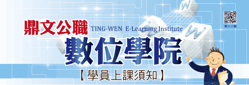 【台北班上課須知】 01、預約方式:一律網路登記,恕不接受電話預約,亦不接受當日預約上課。 02、講義每堂課每人限領一本,未帶講義者,為維護其它學員權益恕不借閱, 如需購買講義,費用為100元/堂課。 03、預約上課學員如未在時間內到班,請提前進行告知或取消。 (若遲到30分鐘後即視同放棄上課,以確保其他學員上課之權益)。 04、課程名稱後面括號內的日期為該課程第一堂開課日期,點選課程時請 務必注意,恕當日無法換片。 05、當日17:00之後,不得預約及修改隔日之課程。 06、請學員於報名的考試/課程結束兩週內完成所有課程,逾期視同放棄補課權益。 備註:若點數尚未使用完畢,一律不得保留,請留心自身權益。 07、轉班申請:學員需提前7個工作天(不含假日)於數位學院「學員中心」線上填寫 好轉班申請表格,並等待工作人員與您聯繫相關轉班事宜,恕不接受任何規定 之外的轉班申請。 備註:報名全科密集班學員可享1次轉班機會,若單科及特殊優惠專案學員即 不符合轉班資格;請學員向報名處的服務人員確定是否符合資格,以 避免事後相關課程爭議。 08、電腦有問題,要告知櫃台人員,切勿擅自更換位置。 09、為維護個人衛生,煩請學員上課時自行攜帶耳機。 10、不能臨時更改預約的課程、不能夠臨時加片。 11、於成功預約上課同時即會扣上課點數1點。 12、預約上課,送出資料時請再次確認,尤其是【教材是否領取的部分】, 若該堂未到請勾選未領取,恕當日無法領取未預約之講義。 13、未攜帶學員證上課的同學,恕無法進教室上課,請學員務必留意。 註:「預約未上課程之總堂數更新時間為每日凌晨0時00分」。 以上開放時間會隨教室使用做調整或變更,如有不便敬請見諒! 【高雄班上課須知】 01、預約方式:一律網路登記,恕不接受電話預約,亦不接受當日預約上課。 02、講義每堂課每人限領一本,未帶講義者,為維護其它學員權益恕不借閱。 目前僅台北班供現場補買講義,其餘分班尚未開放。 03、預約未到者,採取計次方式,預約未到超過三次,則需兩個星期之後才得 以再次登記上課。 04、預約上課學員如未在時間內到班,請提前進行告知或取消。 (若遲到30分鐘後即視同放棄上課,以確保其他學員上課之權益)。 05、課程名稱後面括號內的日期為該課程第一堂開課日期,點選課程時請 務必注意,恕當日無法換片。 06、高雄班上課,前3日17:00之後,即不得預約及修改隔日之課程,請學員按規定 提前約課。 07、請學員於報名的考試/課程結束兩週內完成所有課程,逾期視同放棄補課權益。 備註:若點數尚未使用完畢,一律不得保留,請留心自身權益。 08、轉班申請:學員需提前7個工作天(不含假日)於數位學院「學員中心」線上填寫 好轉班申請表格,並等待工作人員與您聯繫相關轉班事宜,恕不接受任何規定 之外的轉班申請。 備註:報名全科密集班學員可享1次轉班機會,若單科及特殊優惠專案學員即 不符合轉班資格;請學員向報名處的服務人員確定是否符合資格,以 避免事後相關課程爭議。 09、電腦有問題,要告知櫃台人員,切勿擅自更換位置。 10、為維護個人衛生,煩請學員上課時自行攜帶耳機。 11、不能臨時更改預約的課程、不能夠臨時加片。 12、於成功預約上課同時即會扣上課點數1點。 13、預約上課,送出資料時請再次確認,尤其是【教材是否領取的部分】, 若該堂未到請勾選未領取,恕當日無法領取未預約之講義。 14、未攜帶學員證上課的同學,恕無法進教室上課,請學員務必留意。 【停課】 01、數位學院如遇天然災害將依據行政院人事行政局公告(含)以上之停課公告同步 【特殊注意事項】 01、上課扣點以上課堂數為單位,如同上課時段預約3堂課即扣3點,預約1堂課即 | ![]() |